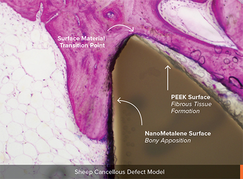 - Preclinical results show greater bone ongrowth on NanoMetalene vs. PEEK